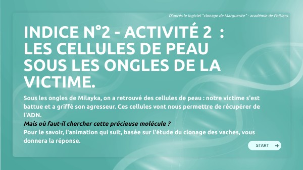 Sous les ongles de Milayka, on a retrouvé des cellules de peau : notre victime s'est battue et a griffé son agresseur. Ces cellules vont nous permettre de récupérer de l'ADN. Mais où faut-il chercher cette précieuse molécule ? Pour le savoir, l'animation qui suit, basée sur l'étude du clonage des vaches, vous donnera la réponse.