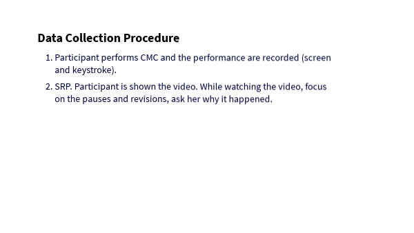 - SRP. Participant is shown the video. While watching the video, focus on the pauses and revisions, ask her why it happened.