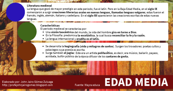 Literatura medieval La lengua que gozó de mayor prestigio en este periodo, fue el latín. Pero en la Baja Edad Media, en el siglo IX comenzaron a surgir creaciones literarias orales en nuevas lenguas, llamadas lenguas vulgares; estas fueron el francés, inglés, alemán, italiano y castellano. En el siglo XII aparecieron las creaciones escritas de estas nuevas lenguas.