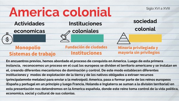 En encuentros previos, hemos abordado el proceso de conquista en America. Luego de esta primera instancia, reconocemos un proceso en el cual los europeos se dividen el territorio americano y se instalan en el, creando diferentes mecanismos de dominación y control. De este modo establecen diferentes instituciones y modos de explotación de la tierra y de los nativos obligados a extraer recursos (principalemnte metales) para enviar a la metroipoli. America, pasa a formar parte de los reinos europeos (España y portugal en un principio y luego Francia, Holanda e Inglaterra se suman a la división territorial) en esta presentación nos detendremos en la America española, donde este reino toma control de la vida politica, economica, social y cultural de sus colonias.