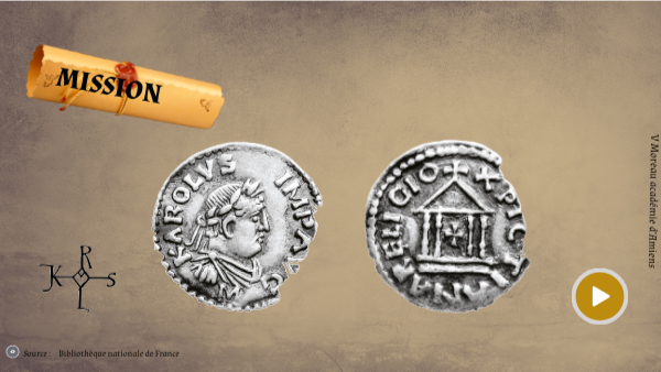 Bonjour, je suis Gérold, un MISSI DOMINICI de Charlemagne : c'est à dire un envoyé du maître. Mon empereur souhaite que tu vérifies l'exactitude de sa monnaie, appelée un DENIER.Il s'agit d'un denier d'argent frappé dans la ville de Mayence ( à 250km d'Aix-La-Chapelle ) vers 812.