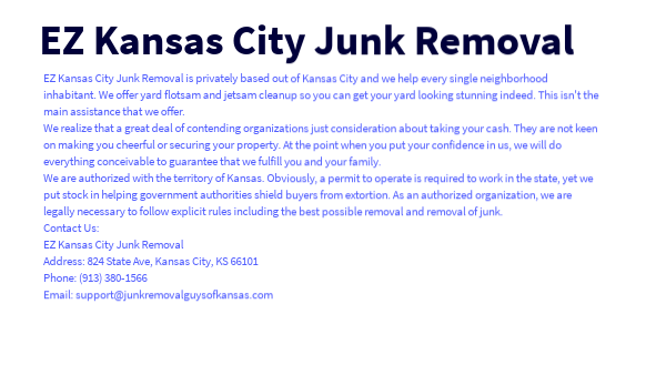 EZ Kansas City Junk Removal is privately based out of Kansas City and we help every single neighborhood inhabitant. We offer yard flotsam and jetsam cleanup so you can get your yard looking stunning indeed. This isn't the main assistance that we offer. We realize that a great deal of contending organizations just consideration about taking your cash. They are not keen on making you cheerful or securing your property. At the point when you put your confidence in us, we will do everything conceivable to guarantee that we fulfill you and your family. We are authorized with the territory of Kansas. Obviously, a permit to operate is required to work in the state, yet we put stock in helping government authorities shield buyers from extortion. As an authorized organization, we are legally necessary to follow explicit rules including the best possible removal and removal of junk. Contact Us: EZ Kansas City Junk Removal Address: 824 State Ave, Kansas City, KS 66101 Phone: (913) 380-1566 Email: support@junkremovalguysofkansas.com Website: https://junkremovalguysofkansas.com