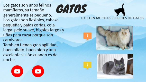 Los gatos son unos felinos mamíferos, su tamaño generalmente es pequeño.Los gatos son flexibles, cabeza pequeña y patas cortas, cola larga, pelo suave, bigotes largos y uñas para cazar porque son carnivoros. Tambien tienen gran agilidad, buen olfato, buen oído y una excelente visión cuando es de noche.