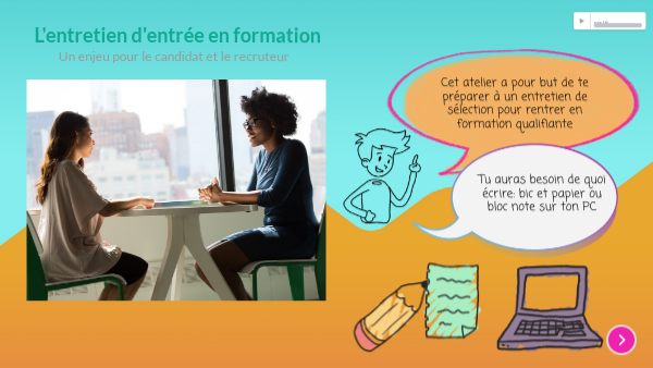 Cet atelier a pour but de te préparer à un entretien de sélection pour rentrer en formation qualifiante
