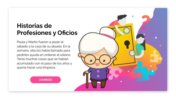 Cuando abrieron el baúl se encontraron con unos bolsos muy particulares. Decidieron investigar cada uno de ellos para ver que tenían dentro. Fue tanto su asombro que decidieron preguntarle a su Abuela. Ella tenía una historia y una foto para cada bolso. Exploralos y descubrí las pistas escondidas en cada uno. En el camino encontrarás profesiones y datos sobre las mismas relacionadas con cada historia.