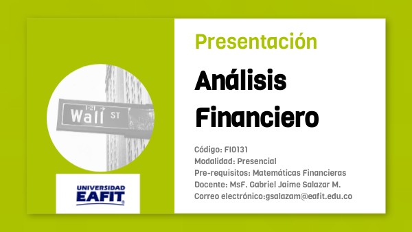 Código: FI0131 Modalidad: Presencial Pre-requisitos: Matemáticas Financieras Docente: MsF. Gabriel Jaime Salazar M. Correo electrónico:gsalazam@eafit.edu.co