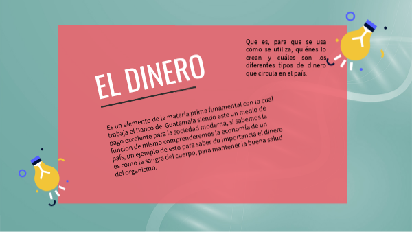 Es un elemento de la materia prima funamental con lo cual trabaja el Banco de Guatemala siendo este un medio de pago excelente para la sociedad moderna, si sabemos la funcion de mismo comprenderemos la economía de un país, un ejemplo de esto para saber du importancia el dinero es como la sangre del cuerpo, para mantener la buena salud del organismo.