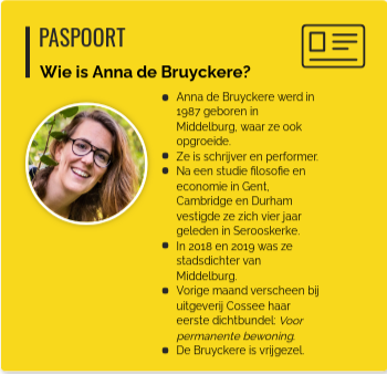 Anna de Bruyckere werd in 1987 geboren in Middelburg, waar ze ook opgroeide. Ze is schrijver en performer. Na een studie filosofie en economie in Gent, Cambridge en Durham vestigde ze zich vier jaar geleden in Serooskerke. In 2018 en 2019 was ze stadsdichter van Middelburg. Vorige maand verscheen bij uitgeverij Cossee haar eerste dichtbundel: Voor permanente bewoning. De Bruyckere is vrijgezel.