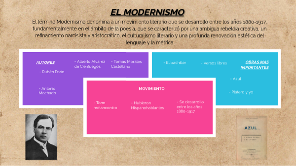 El término Modernismo denomina a un movimiento literario que se desarrolló entre los años 1880-1917, fundamentalmente en el ámbito de la poesía, que se caracterizó por una ambigua rebeldía creativa, un refinamiento narcisista y aristocrático, el culturalismo literario y una profunda renovación estética del lenguaje y la métrica