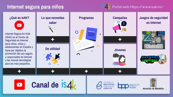 Internet Segura for Kids (IS4K) es el Centro de Seguridad en Internet para niños, niñas y adolescentes en España y tiene por objetivo la promoción del uso seguro y responsable de Internet y las nuevas tecnologías para los más pequeños.