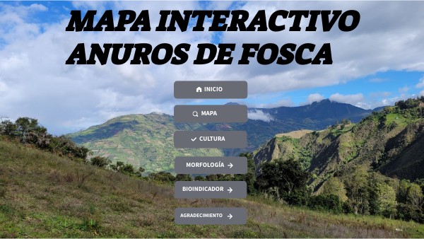 A continuación veras el recurso digital realizado en el mes de Julio del 2021 que recopila los hallazgos de anuros observados en Fosca -Cundinamarca por los estudiantes y titular, a su vez, posee información que es complementada desde lo teórico. Lo anterior fue presentado como trabajo de grado de la licenciatura en Biología de la Universidad Pedagógica Nacional por la maestra en formación Paula Romero, quien realizo este trabajo de grado junto con algunos estudiantes del Semillero de Investigación de Estudios Herpetológicos Ranitomeya. El siguiente mapa interactivo te permitira ver de forma dinamica las 24 veredas que conforman el municipio de Fosca, aquí encontraras el registro de la ubicación geoespacial de algunos anuros representativos, los cuales fueron observados y registrados en campo en tu municipio, a su vez alberga hallazgos realizados por los estudiantes pertenecientes al semillero, quienes han encontrado anuros en la zona norte del municipio en 10 veredas como: