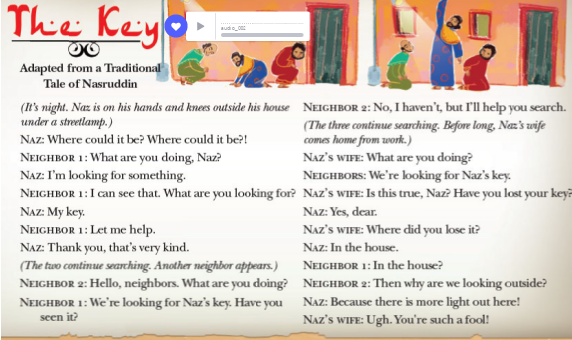 1. Read and listen to the text: THE KEY 2. Answer the next questions in your notebook: a. WHERE DOES THE PLAY TAKE PLACE?, HOW DO YOU KNOW? b. THE MOST IMPORTANT CHARACTER IS CALLED THE MAIN CHARACTER. WHO IS THE MAIN CHARACTER IN THIS PLAY? c. ARE THE OTHER CHARACTERS IN THIS STORY IMPORTANT? WHY OR WHY NOT? d. THE PEOPLE WHO READ, WATCH OR LISTEN TO A STORY ARE THE AUDIENCE. WHO IS THE AUDIENCE OF THIS PLAY? CHILDREN, ADULTS, OR SOMEONE ELSE? e. THE EXPRESSIONS IN ITALICS ARE CALLED STAGE DIRECTIONS. WHAT DO YOU THINK THEY ARE FOR? f. WHERE ARE TEATHER PLAYS NORMALLY PERFORMED? g. HAVE YOU EVER SEEN A THEATER PLAY? h. WHAT DO YOU THINK A THEATER PLAY SHOULD HAVE? 3. IF YOU DON'T UNDERSTAND ALL THE WORDS, YOU CAN USE THE NEXT DICTIONARY: https://www.spanishdict.com/