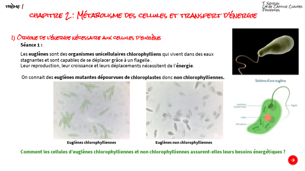 Les euglènes sont des organismes unicellulaires chlorophylliens qui vivent dans des eaux stagnantes et sont capables de se déplacer grâce à un flagelle . Leur reproduction, leur croissance et leurs déplacements nécessitent de l’énergie. On connait des euglènes mutantes dépourvues de chloroplastes donc non chlorophylliennes.