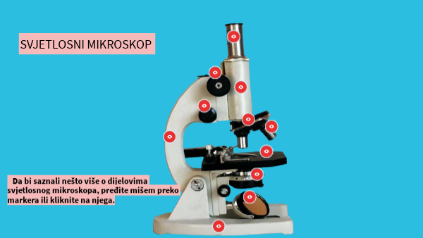 Da bi saznali nešto više o dijelovima svjetlosnog mikroskopa, pređite mišem preko markera ili kliknite na njega.