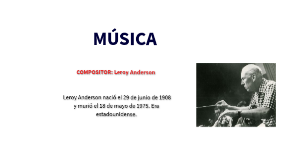 COMPOSITOR: Leroy Anderson Leroy Anderson nació el 29 de junio de 1908 y murió el 18 de mayo de 1975. Era estadounidense.