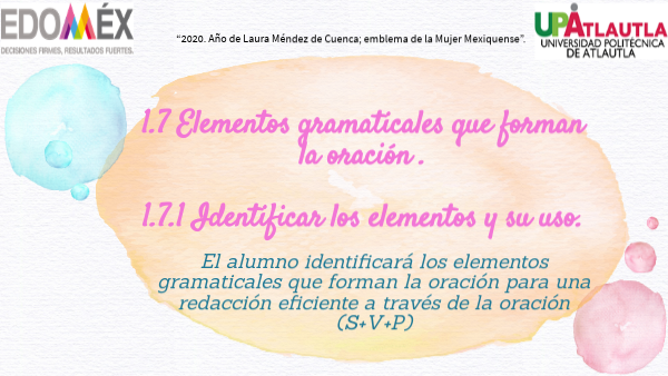 1.7 Elementos gramaticales que forman la oración .1.7.1 Identificar los elementos y su uso.