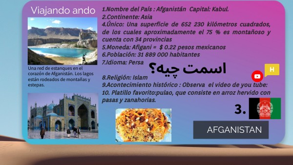 1.Nombre del País : Afganistán Capital: Kabul.2.Continente: Asia 4.Único: Una superficie de 652 230 kilómetros cuadrados, de los cuales aproximadamente el 75 % es montañoso y cuenta con 34 provincias 5.Moneda: Afigani = $ 0.22 pesos mexicanos 6.Población: 31 889 000 habitantes 7.Idioma: Persa 8.Religión: Islam 9.Acontecimiento histórico : Observa el video de you tube: 10. Platillo favorito:pulao, que consiste en arroz hervido con pasas y zanahorias.