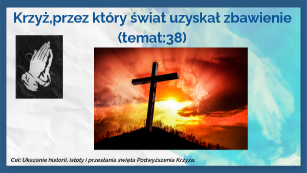 Temat: Krzyż, przez który świat uzyskał zbawienie. 1. Jezus Chrystus dla naszego zbawienia umarł na krzyżu. Krzyż stał się znakiem bezgranicznej miłości Boga do człowieka. 2. 14 września obchodzimy święto Podwyższenia Krzyża Świętego.