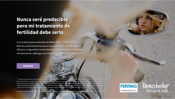 1. Información para prescribir Rekovelle®.2. Nyboe Andersen A, et al. Individualized versus conventional ovarian stimulation for in vitro fertilization: a multicenter, randomized, controlled, assessor-blinded, phase 3 noninferiority trial. Fertility and Sterility. 2017; 107(2): 387-396.e4. 3. Fauser BC, Diedrich K, Devroey P. Predictors of ovarian response: progress towards individualized treatment in ovulation induction and ovarian stimulation. Human Reproduction Update. 2008: 14(1): 1-14. 4. La Marca A, Sunkara SK. Individualization of controlled ovarian stimulation in IVF using ovarian reserve markers: from theory to practice. Human Reproduction Update. 2014; 20(1): 124-140. 5. Steward RG, et al. Oocyte number as a predictor for ovarian hyperstimulation syndrome and live birth: an analysis of 256,381 in vitro fertilization cycles. Fertility and Sterility. 2014; 101(4): 967-974. 6. National Institute for Health and Care Excellence (NICE). Fertility Problems: Assessment and Treatment (CG156) Clinical Guideline 2013. Reino Unido: NICE; 2013. Consultado marzo 2019. Disponible para su consulta en: http://www.nice.org.uk/guidance/cg156 7. Maciel GAR, et al. About the Anti-Müllerian Hormone (AMH) Uses in the Clinical Practice. Rev Bras Ginecol Obstet 2018;40:661-663. 8. Ferring International Center SA. Recombinant FSH including alpha 2,3- and alpha 2,6-sialylation. 2009 October 22. World Intellectual Property Organization: WO 2009/127826 A1. Consultado abril 2019. Disponible en: https://www.lens.org/images/patent/AU/2009237479/A1/20101111/AU_2009_237479_A1.pdf 9. Olsson H, et al. Different pharmacokinetic and pharmacodynamic properties of recombinant follicle-stimulating hormone (rFSH) derived from a human cell line compared with rFSH from a non-human cell line. The Journal of Clinical Pharmacology. 2014;54 (11) 1299-1307. 10. Nelson SM, et al. Serum anti-Müllerian hormone and FSH: prediction of live birth and extremes of response in stimulated cycles–implications for individualization of therapy. Human Reproduction. 2007; 22(9): 2414-2421. 11. Nelson SM, et al. Anti-Müllerian hormone-based approach to controlled ovarian stimulation for assisted conception. Human Reproduction. 2009; 24(4): 867-875. 12. Iliodromiti S, et al. Technical and performance characteristics of anti-Müllerian hormone and antral follicle count as biomarkers of ovarian response. Human Reproduction Update. Diciembre 2014: 1-13. 13. Bosch E, et al. Follitropin delta in repeated ovarian stimulation for IVF: a controlled, assessor-blind Phase 3 safety trial. Reprod Biomed Online. 2019;38(2):195-205. 14. Nelson SM. et al. Comparison of antimüllerian hormone levels and antral follicle count as predictor of ovarian response to controlled ovarian stimulation in good-prognosis patients at individual fertility clinics in two multicenter trials. Fertility and Sterility 2015;103(4):923-930.e1. 15. Anderson RA, et al. Prospective study into the value of the automated Elecsys antimüllerian hormone assay for the assessment of the ovarian growing follicle pool. Fertility and Sterility. 2015; 103(4):1074-1080.e4. 16. La Marca A, et al. Normal serum anti-Müllerian hormone levels in the general female population and the relationship with reproductive history. European Journal of Obstetrics & Gynecology and Reproductive Biology. 2012;163:180-184. Material exclusivo para profesionales de la salud (Privado)