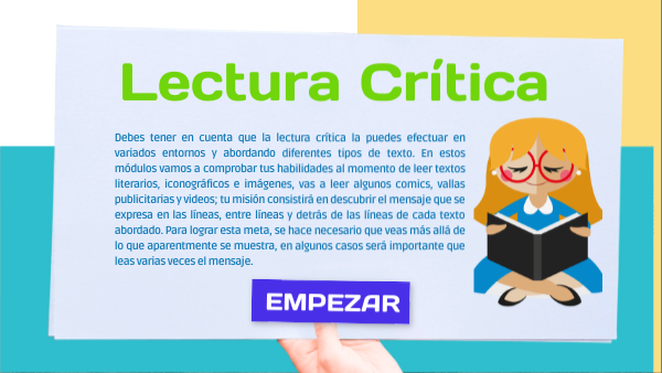 Debes tener en cuenta que la lectura crítica la puedes efectuar en variados entornos y abordando diferentes tipos de texto. En estos módulos vamos a comprobar tus habilidades al momento de leer textos literarios, iconográficos e imágenes, vas a leer algunos comics, vallas publicitarias y videos; tu misión consistirá en descubrir el mensaje que se expresa en las líneas, entre líneas y detrás de las líneas de cada texto abordado. Para lograr esta meta, se hace necesario que veas más allá de lo que aparentmente se muestra, en algunos casos será importante que leas varias veces el mensaje.