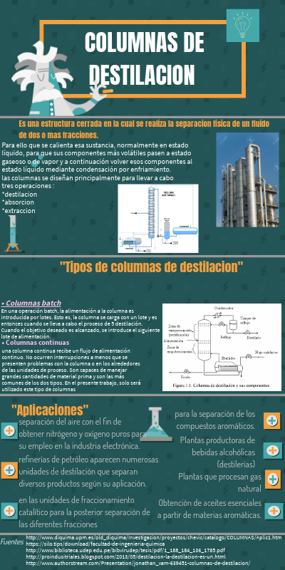 http://www.diquima.upm.es/old_diquima/Investigacion/proyectos/chevic/catalogo/COLUMNAS/Aplic1.htmhttps://silo.tips/download/facultad-de-ingenieria-quimica http://www.biblioteca.udep.edu.pe/bibvirudep/tesis/pdf/1_188_184_136_1785.pdf http://proindusitriales.blogspot.com/2013/05/destilacion-la-destilacion-es-un.html http://www.authorstream.com/Presentation/jonathan_vam-639451-columnas-de-destilacion/