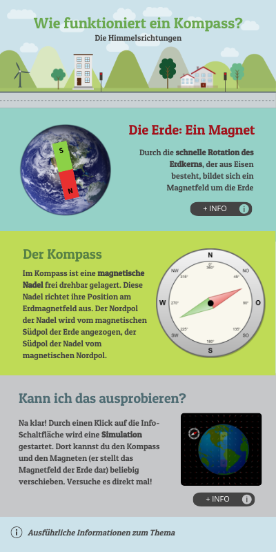Na klar! Durch einen Klick auf die Info-Schaltfläche wird eine Simulation gestartet. Dort kannst du den Kompass und den Magneten (er stellt das Magnetfeld der Erde dar) beliebig verschieben. Versuche es direkt mal!