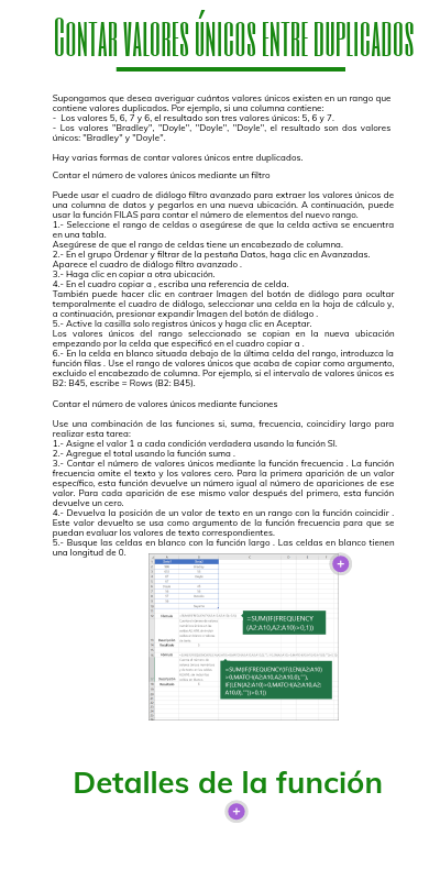 Contar el número de valores únicos mediante funciones Use una combinación de las funciones si, suma, frecuencia, coincidiry largo para realizar esta tarea: 1.- Asigne el valor 1 a cada condición verdadera usando la función SI. 2.- Agregue el total usando la función suma . 3.- Contar el número de valores únicos mediante la función frecuencia . La función frecuencia omite el texto y los valores cero. Para la primera aparición de un valor específico, esta función devuelve un número igual al número de apariciones de ese valor. Para cada aparición de ese mismo valor después del primero, esta función devuelve un cero. 4.- Devuelva la posición de un valor de texto en un rango con la función coincidir . Este valor devuelto se usa como argumento de la función frecuencia para que se puedan evaluar los valores de texto correspondientes. 5.- Busque las celdas en blanco con la función largo . Las celdas en blanco tienen una longitud de 0.