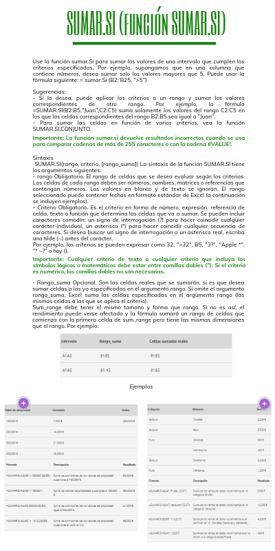 Sintaxis SUMAR.SI(rango, criterio, [rango_suma]) La sintaxis de la función SUMAR.SI tiene los argumentos siguientes: - rango Obligatorio. El rango de celdas que se desea evaluar según los criterios. Las celdas de cada rango deben ser números, nombres, matrices o referencias que contengan números. Los valores en blanco y de texto se ignoran. El rango seleccionado puede contener fechas en formato estándar de Excel (a continuación se incluyen ejemplos). - Criterio Obligatorio. Es el criterio en forma de número, expresión, referencia de celda, texto o función que determina las celdas que va a sumar. Se pueden incluir caracteres comodín: un signo de interrogación (?) para hacer coincidir cualquier carácter individual, un asterisco (*) para hacer coincidir cualquier secuencia de caracteres. Si desea buscar un signo de interrogación o un asterisco real, escriba una tilde (~) antes del carácter. Por ejemplo, los criterios se pueden expresar como 32, ">32", B5, "3?", "Apple *", "* ~?" o hoy ().