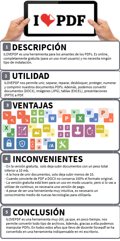 ILOVEPDF es una herramienta muy útil, ya que, en poco tiempo, nos permite convertir todo tipo de archivos. Además, gracias a ella podemos manipular PDFs. En todos estos años que llevo de docente Ilovepdf se ha convertido en una herramienta indispensable en mi escritorio.