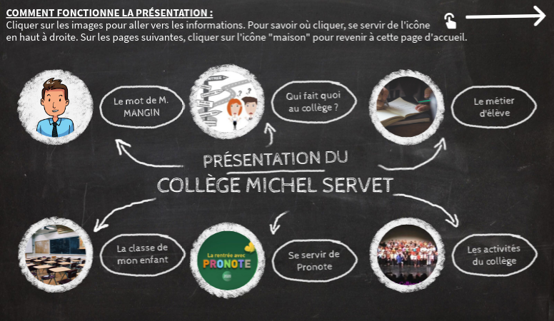 COMMENT FONCTIONNE LA PRÉSENTATION : Cliquer sur les images pour aller vers les informations. Pour savoir où cliquer, se servir de l'icône en haut à droite. Sur les pages suivantes, cliquer sur l'icône "maison" pour revenir à cette page d'accueil.