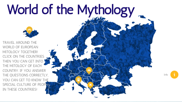 TRAVEL AROUND THE WORLD OF EUROPEAN MITOLOGY TOGETHER! CLICK ON THE COUNTRIES THEN YOU CAN GET INTO THE MITOLOGY OF EACH COUNTRY. IF YOU ANSWER THE QUESTIONS CORRECTLY, YOU CAN GET TO KNOW THE SPECIAL CULTURE OF PEOPLE IN THESE COUNTRIES!