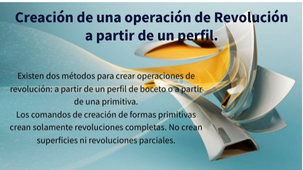 Existen dos métodos para crear operaciones de revolución: a partir de un perfil de boceto o a partir de una primitiva. Los comandos de creación de formas primitivas crean solamente revoluciones completas. No crean superficies ni revoluciones parciales.