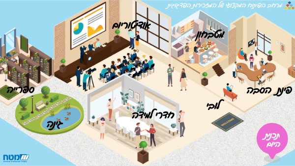 המרחב שאתם מתכנסים בו היום מורכב ממתחמים שונים, שבכל אחד מהם תתקיים פעילות אחרת .בהתאם לסדר היום. לאורך היום תעברו בין החדרים השונים לפי סדר היום המתוכנן שימו לב לשעות הפעילות בכל אחד מהאזורים, ונווטו במרחב הפיזיטלי בלחיצה על האיזורים אליהם תתבקשו להכנס ?מה חשוב לדעת לאורך היום תתארחו במרחב הדיגיטלי המשותף שלנו, ובמקביל תתבקשו גם להכניס את כולנו אל המרחב הפיזי שלכם על מנת שנוכל לחוות חוויה פיזיטלית מיטבית. כדי לעשות זאת אנא הדליקו את מצלמת הרשת שלכם בכל חדר זום שאליו תיכנסו, ודאגו לסביבה נוחה לשיתוף - אזור שקט, חדר מאורגן ומואר, לבוש הולם