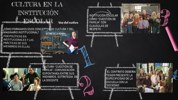 - Cada cultura institucional puede tener: diferentes modelos de gestión y estos afectan en esa cultura. A los actores institucionales y las características particulares de cada establecimiento. La docente institucionaliza la "cùltura del consenso" con los actores escolares por medio didacticas progresitas la escuela la cultura del esfuerzo y del juego compartido para generar conocimiento, estableció horarios, consigue material para estudio, dialoga de manera directa. Usa estrategias pedagógicas enriquece la clase con mucho soporte audio visual para ampliar la cultura general y mostrarles una vida más grata y con valores que los hacen sentir sujetos plenos de derechos, pero también de obligaciones. Los padres también adoptaron este ritmo de vida y se superan poco a poco.