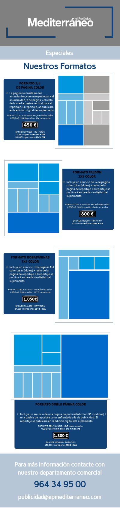 - Incluye un anuncio de ¼ de página color (15 módulos) + resto de la página de reportaje. El reportaje se publicará en la edición digital del suplemento