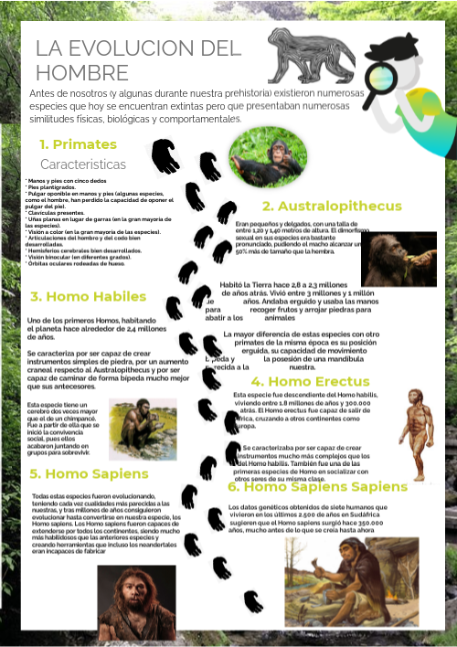 Todas estas especies fueron evolucionando, teniendo cada vez cualidades más parecidas a las nuestras, y tras millones de años consiguieron evolucionar hasta convertirse en nuestra especie, los Homo sapiens. Los Homo sapiens fueron capaces de extenderse por todos los continentes, siendo mucho más habilidosos que las anteriores especies y creando herramientas que incluso los neandertales eran incapaces de fabricar