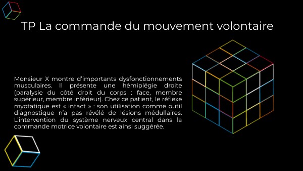 Proposer une démarche d’investigation permettant localiser la région du cortex à l’origine des messages moteurs volontaires de la partie droite du patient Réaliser le protocole proposé et traiter les images IRM su sujet sain. Présenter sous la forme de votre choix l'exploitation du document obtenu Exploiter et mettre en relation tous les résultats obtenus afin d’expliquer à votre patient Monsieur X, l’origine de son hémiplégie droite.