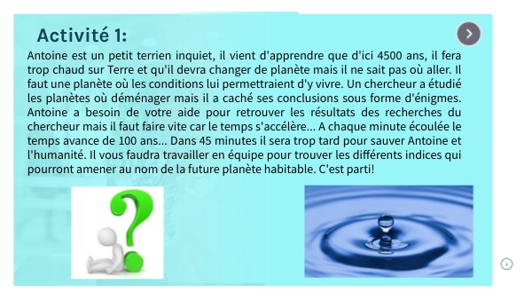 Antoine est un petit terrien inquiet, il vient d'apprendre que d'ici 4500 ans, il fera trop chaud sur Terre et qu'il devra changer de planète mais il ne sait pas où aller. Il faut une planète où les conditions lui permettraient d'y vivre. Un chercheur a étudié les planètes où déménager mais il a caché ses conclusions sous forme d'énigmes. Antoine a besoin de votre aide pour retrouver les résultats des recherches du chercheur mais il faut faire vite car le temps s'accélère... A chaque minute écoulée le temps avance de 100 ans... Dans 45 minutes il sera trop tard pour sauver Antoine et l'humanité. Il vous faudra travailler en équipe pour trouver les différents indices qui pourront amener au nom de la future planète habitable. C'est parti!
