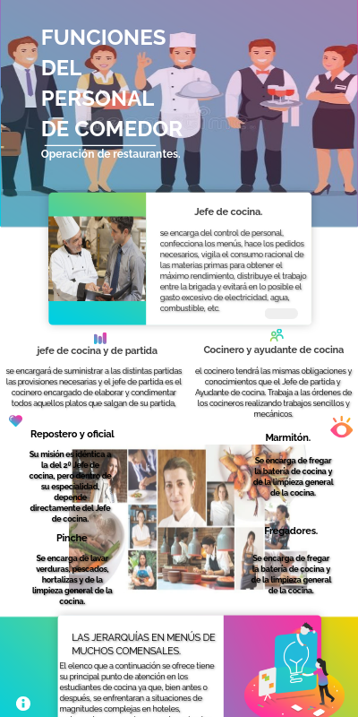 El elenco que a continuación se ofrece tiene su principal punto de atención en los estudiantes de cocina ya que, bien antes o después, se enfrentaran a situaciones de magnitudes complejas en hoteles, restaurants, ceremonias o eventos privados donde los repartos de tareas y las jerarquías deben de estar muy bien definidos.