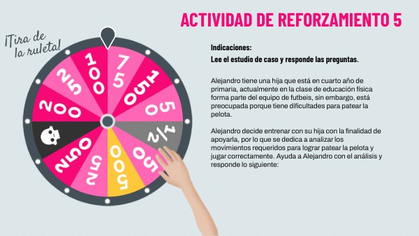 Alejandro tiene una hija que está en cuarto año de primaria, actualmente en la clase de educación física forma parte del equipo de futbeis, sin embargo, está preocupada porque tiene dificultades para patear la pelota. Alejandro decide entrenar con su hija con la finalidad de apoyarla, por lo que se dedica a analizar los movimientos requeridos para lograr patear la pelota y jugar correctamente. Ayuda a Alejandro con el análisis y responde lo siguiente: