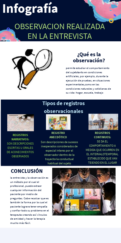 la entrevista y la observación es un método por el cual el profesional, puede extraer cualquier información del paciente por medio de preguntas. Cabe recalcar que es también la forma por la cual el paciente lograra tener empatía y confiar todo su problema en el terapeuta creando así vínculos de amistad y hacer la terapia mucho más fácil.