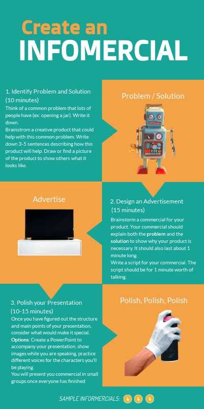Once you have figured out the structure and main points of your presentation, consider what would make it special. Options: Create a PowerPoint to accompany your presentation, show images while you are speaking, practice different voices for the characters you'll be playing. You will present you commercial in small groups once everyone has finished