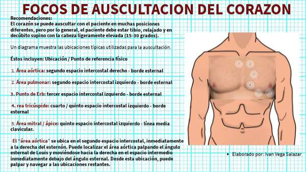 Recomendaciones:El corazón se puede auscultar con el paciente en muchas posiciones diferentes, pero por lo general, el paciente debe estar tibio, relajado y en decúbito supino con la cabeza ligeramente elevada (15-30 grados). Un diagrama muestra las ubicaciones típicas utilizadas para la auscultación. Éstos incluyen: Ubicación / Punto de referencia físico 1. Área aórtica: segundo espacio intercostal derecho - borde esternal 2. Área pulmonar: segundo espacio intercostal izquierdo - borde esternal 3. Punto de Erb: tercer espacio intercostal izquierdo - borde esternal 4. rea tricúspide: cuarto / quinto espacio intercostal izquierdo - borde esternal 5. Área mitral / ápice: quinto espacio intercostal izquierdo - línea media clavicular. El “área aórtica” se ubica en el segundo espacio intercostal, inmediatamente a la derecha del esternón. Puede localizar el área aórtica palpando el ángulo esternal de Louis y moviéndose hacia la derecha en el espacio intermedio inmediatamente debajo del ángulo esternal. Desde esta ubicación, puede palpar y navegar a las ubicaciones restantes.
