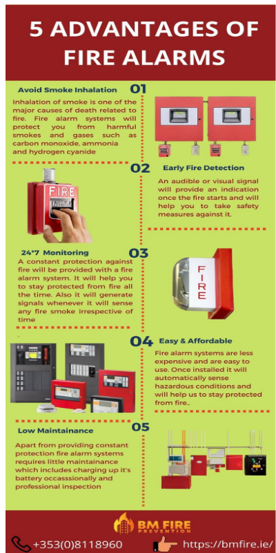 There are many advantages of fire alarms. It helps avoid smoke inhalation. Inhaling smoke causes death related to fire. The alarms protect you from harmful gases and smokes such as ammonia, hydrogen cyanide and carbon monoxide. Next, fire alarms help in early fire detection. Know more :https://bmfir