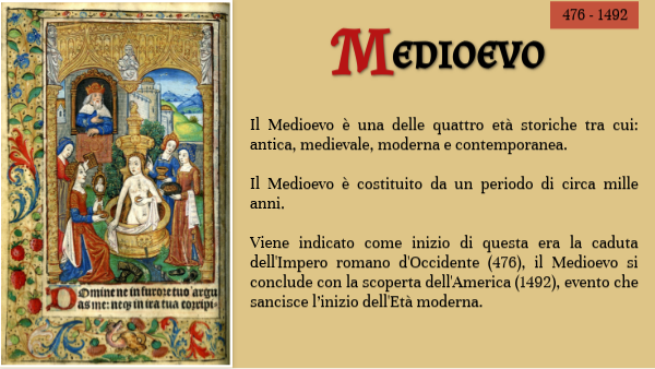 Il Medioevo è una delle quattro età storiche tra cui: antica, medievale, moderna e contemporanea. Il Medioevo è costituito da un periodo di circa mille anni. Viene indicato come inizio di questa era la caduta dell'Impero romano d'Occidente (476), il Medioevo si conclude con la scoperta dell'America (1492), evento che sancisce l’inizio dell'Età moderna.