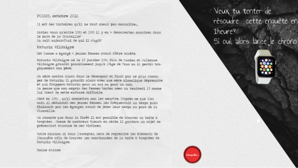 Veux tu tenter de résoudre cette enquête en 1heure? Si oui, alors lance le chrono