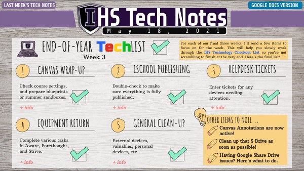 For each of our final three weeks, I'll send a few items to focus on for the week. This will help you slowly work through the IHS Technology Checkout List so you're not scrambling to finish at the very end. Here's the final list!