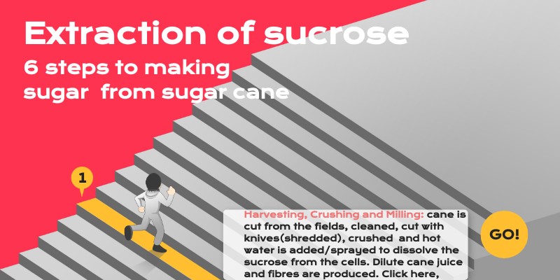 Harvesting, Crushing and Milling: cane is cut from the fields, cleaned, cut with knives(shredded), crushed and hot water is added/sprayed to dissolve the sucrose from the cells. Dilute cane juice and fibres are produced. Click here,