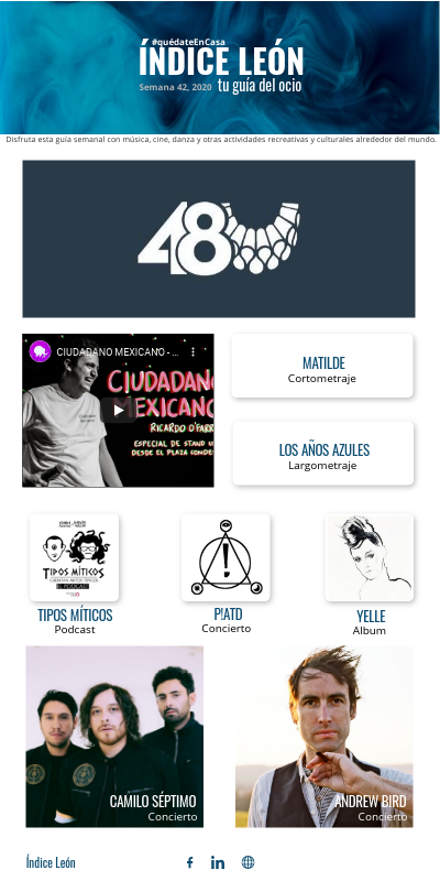 Disfruta esta guía semanal con música, cine, danza y otras actividades recreativas y culturales alrededor del mundo.