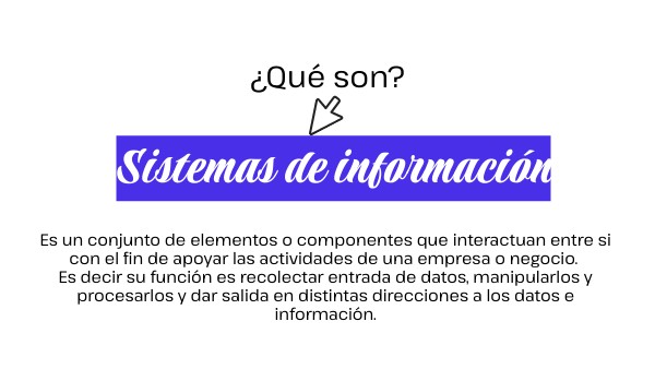 Es un conjunto de elementos o componentes que interactuan entre si con el fin de apoyar las actividades de una empresa o negocio. Es decir su función es recolectar entrada de datos, manipularlos y procesarlos y dar salida en distintas direcciones a los datos e información.